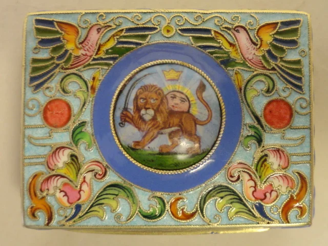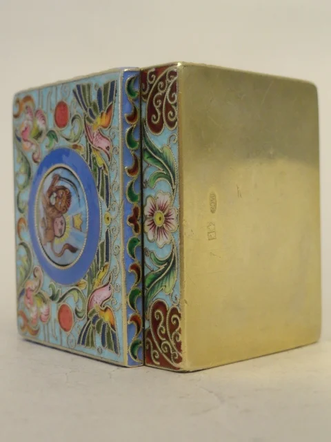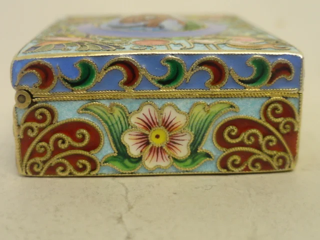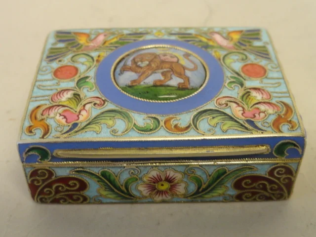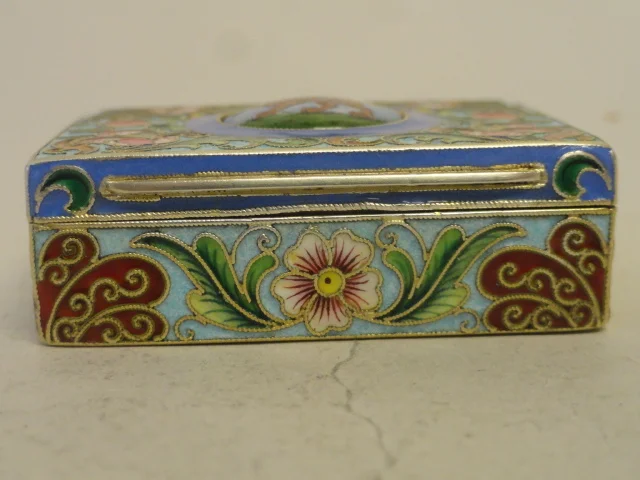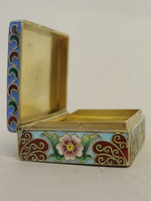 A beautiful antique Russian silver 84 cloisonne enamel pill box by Feodor Ruckert. Size is 2L x 1.5W inches. Weight is 61 grams..