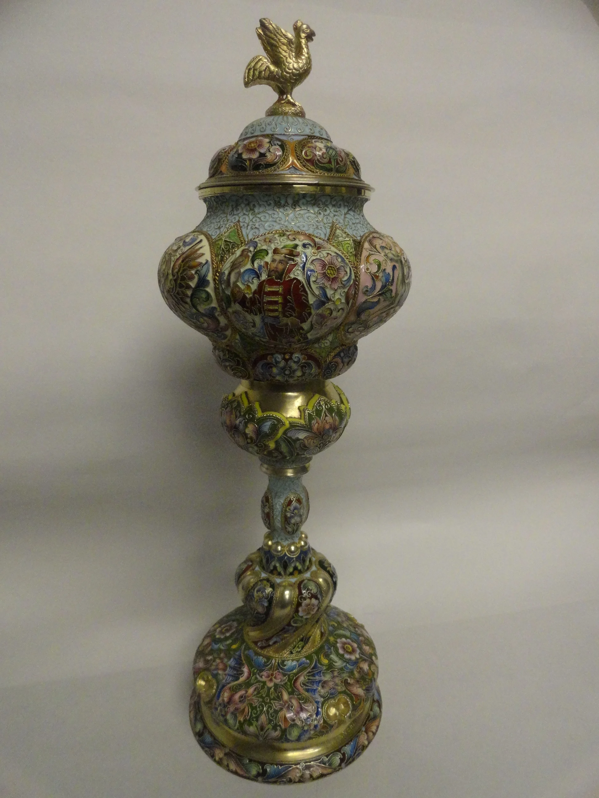 A significant antique Russian gilded silver 88 and cloisonné enamel goblet and cover by Fedor Ruckert, Moscow, dated 1906. A present of Tsar Nicolas II and Tsarina Alexandra Feodorovna to her brother the Grand Duke of Hesse.